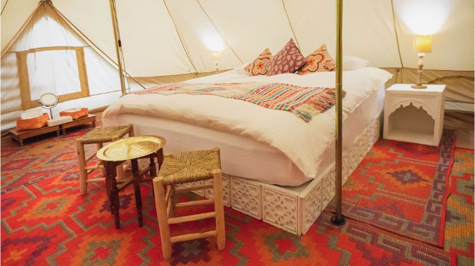 テント内はモロッカンテイストでラグジュアリーな空間になっており、とってもお洒落なインテリアに囲まれて過ごすことができます。WiFiやコンセントもテント内で使用可能なので、こんな自然に囲まれたお洒落空間でリモートワークも実現します。プライベート感満載なのでゆっくりした時間が流れています。