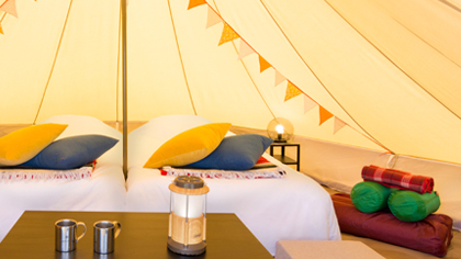 開放感たっぷりのロケーションでプライベートな時間を過ごすことができます。内装にこだわったテントは、各テントごとに家具や備品の雰囲気が違うようです。可愛い内装とふかふかのベッド・・・最高ですね。