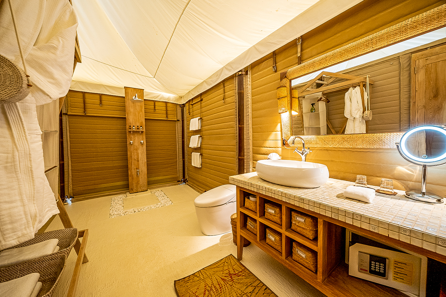 「LUXURY TENT(ラグジュアリーテント37.5㎡・定員3名まで)」、 「SUITE TENT(スイートテント50㎡・定員4名まで)」と、テント内部がかなり大きいのが特徴で、エアコン・バス・トイレ・冷蔵庫は全て個別で完備されています。