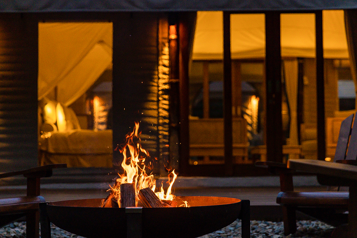 贅沢な大自然の中で、贅沢なひとときを。夜空の下でゆったりと座り、暖かな焚き火に囲まれて自然の息吹を感じることができます。焚き火は、まるで時間がゆっくりと流れているかのような、心地よい時間が過ごせます。